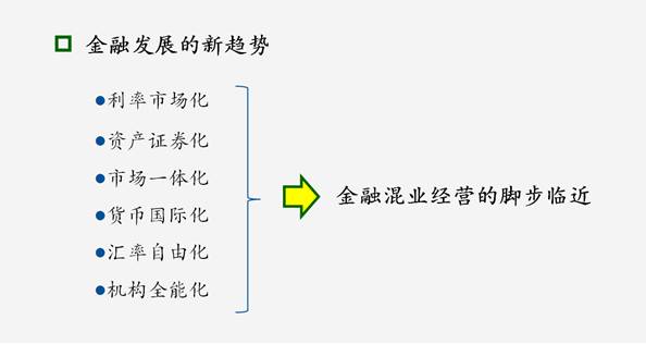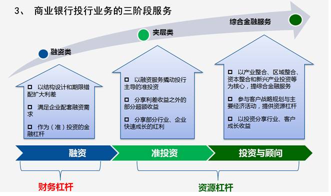 现在我们正在向第三个阶段前进,就是综合金融服务,以产业整合、区域整合、资本整合和新兴产业投资等为核心,参与客户战略规划与主要经济活动,提供资源杠杆。其本质就是给客户提供综合的一揽子的解决方案,在这个过程中有融资,有准投资,有投资。