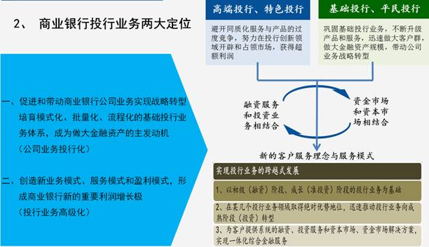 本文根据作者在智信资管咖啡第10期上的发言整理。在中国经济和金融经历重大转型期的背景下,商业银行投行业务首先能促进和带动商业银行公司业务的战略转型,特别是培育模式化、批量化、流程化的基础投行业务体系,成为做大金融资产的主发动机;其次能创造新的业务模式、服务模式和盈利模式,形成商业银行新的重要利润增长极。