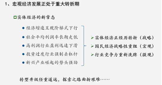 宏观经济方面,我认为中国的宏观经济发展正处于重大转折期,也就是走向了经济“新常态”:即L形的经济走势。在这个过程中我们有以下几个基本判断:经济增速可能会维持三五年6%到7%的增长,之后还会逐步向下。如果20年后我们回望,这20年的经济增长趋势大概率向下的,并且在向下的过程中可能没有多少真正的反弹。