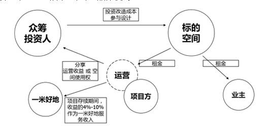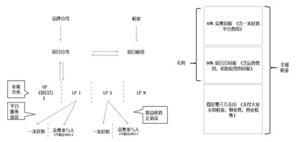 (二)收益权众筹:投资改造成本,回报从毛利中分成。全部租金除去固定第三方支出 (支付大业主的租金,物业费,营业税等)剩余的毛利中,40%为众筹回报 (含一米好地平台费用),60% 项目方回报 (含运营费用,初始投资的回报)。