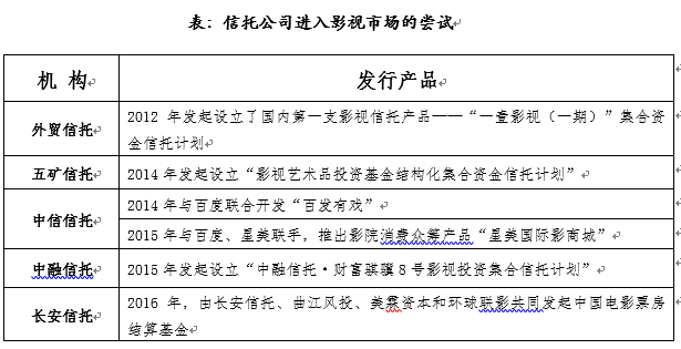 尽管影视投资存在巨大的风险,但面对影视产业高速发展的红利窗口,金融机构也按捺不住“下水”的冲动。以信托公司为例,各机构纷纷进入影视行业“试水”。
